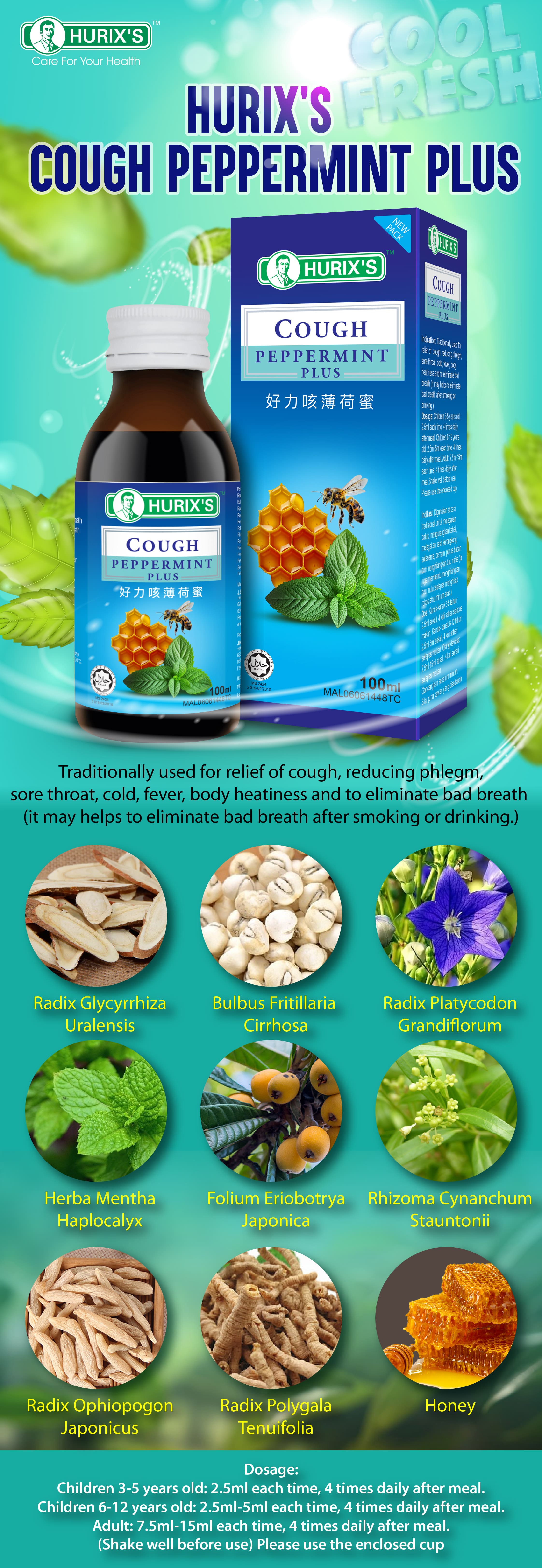 Traditionally used for relief of cough, reducing phlegm, sore throat, cold, fever, body heatiness and to eliminate bad breath. (it may helps to eliminate bad breath after smoking or drinking.