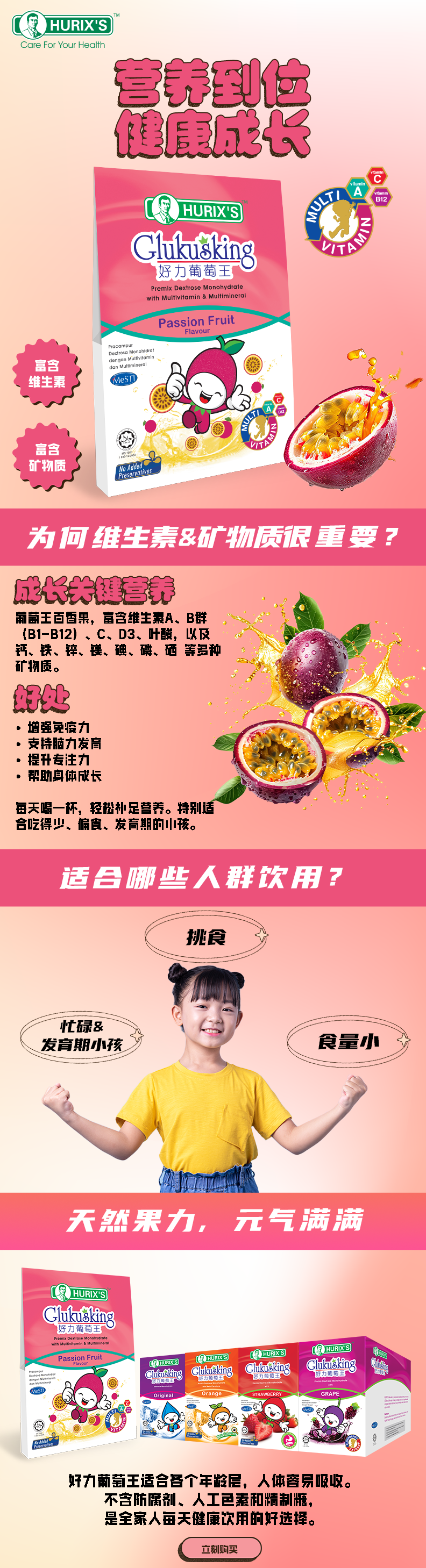 好力葡萄王-百香果是富含综合维生素和矿物质(维生素 A, 维生素B1,B2,B3,B5,B6,B7,B12,维生素C,维生素D3,叶酸,钙,碘,铁,镁,磷,硒和锌)的葡萄糖饮料。让您享受一杯美味解渴的饮料之余,补充我们身体所需要的维生素。